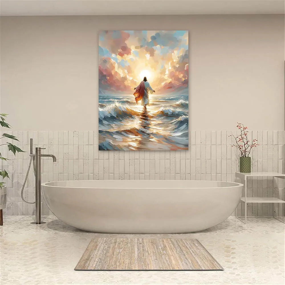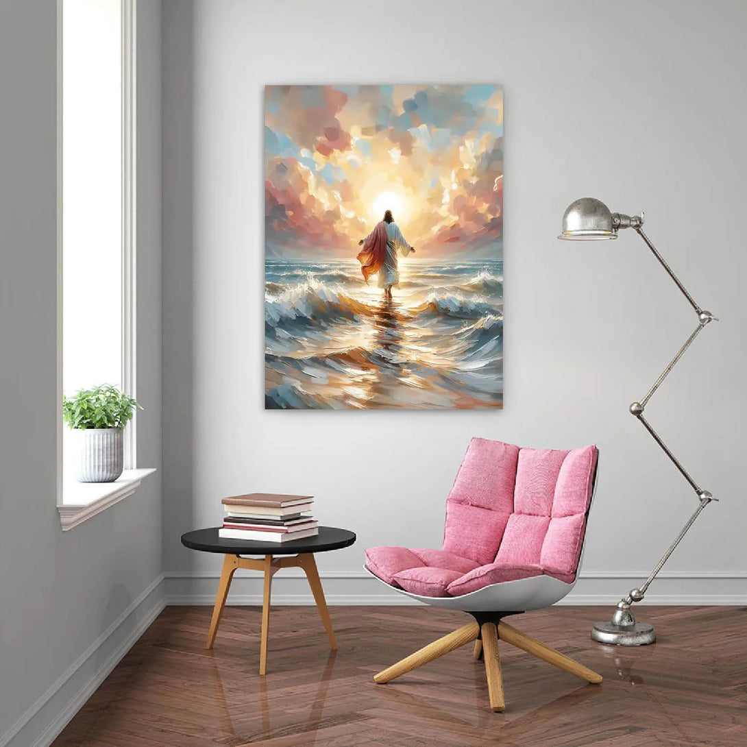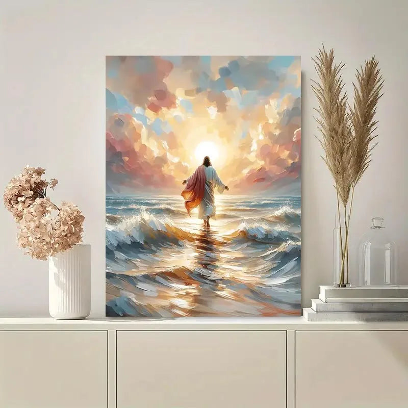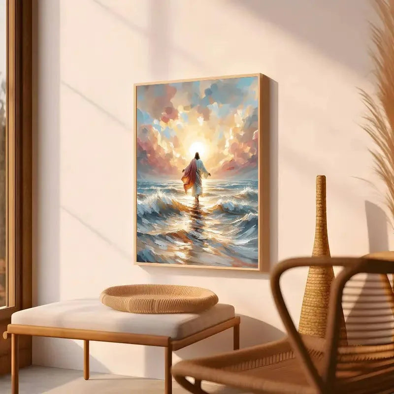 Inspirational wall poster depicting Jesus walking on water — a powerful symbol of faith, hope, and divine strength. Perfect for home, church, or meditation spaces.