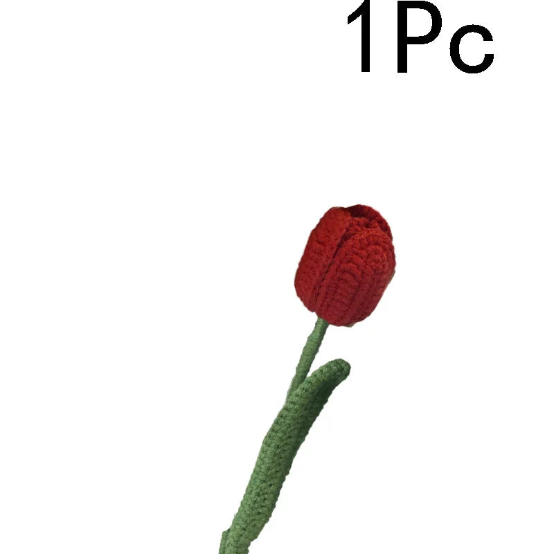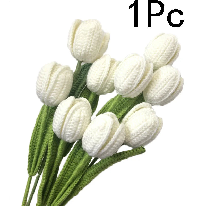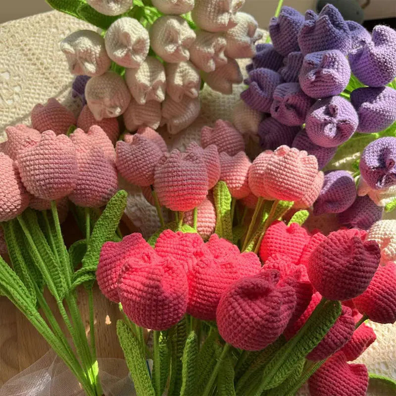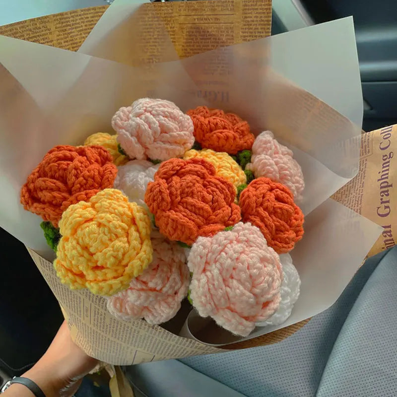 Knitted rose and tulip flower wedding bouquet. Handmade with care, elegant, and perfect for brides or romantic home décor accents.
