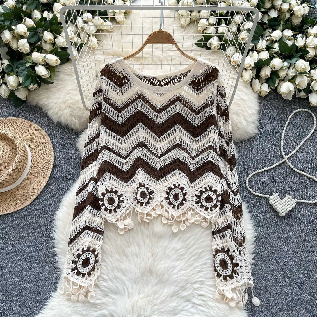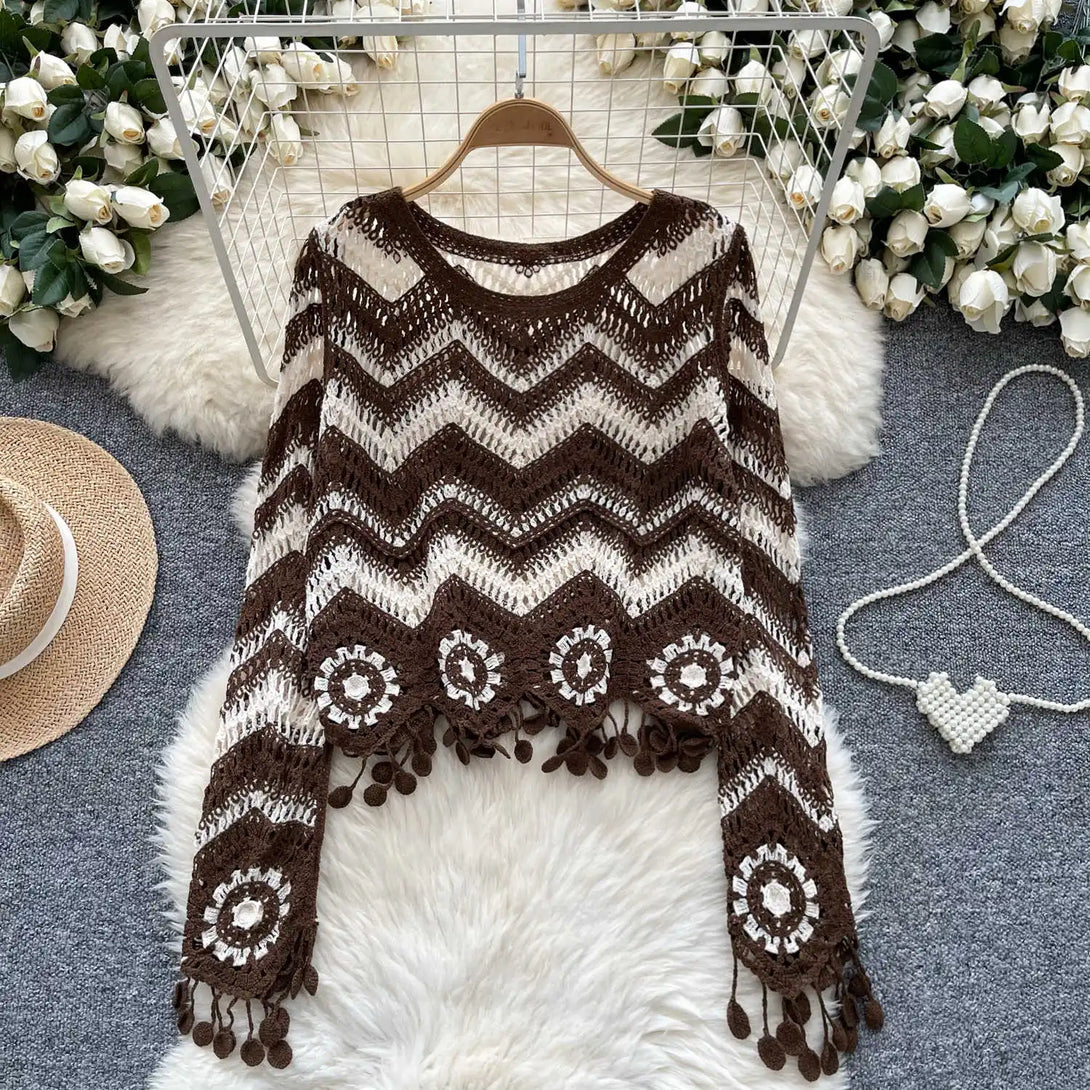 Handmade knitted V-neck wavy striped crochet sweater. Soft, stylish, and perfect for casual wear, adding comfort and boho charm to your look.