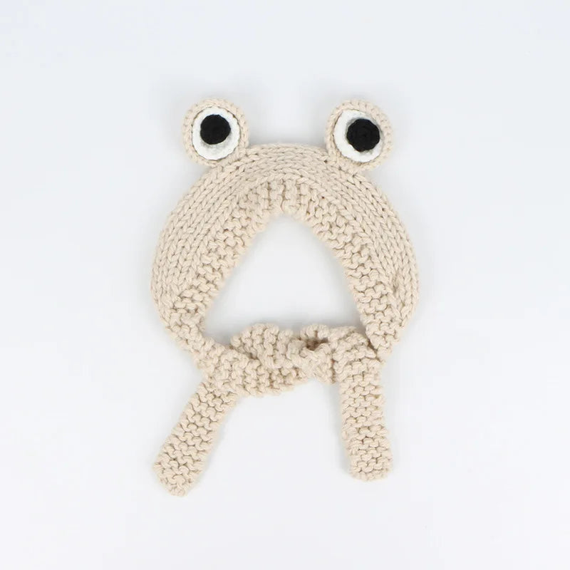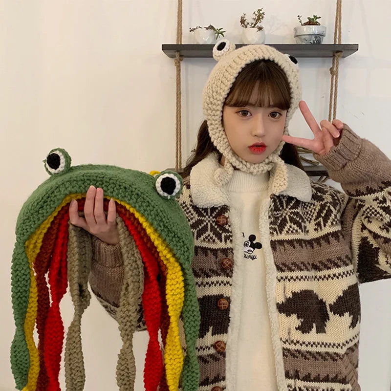 Frog Crochet Hat — handmade and adorable with cozy cottagecore charm. Perfect for kawaii, Y2K, or playful soft girl aesthetic outfits.