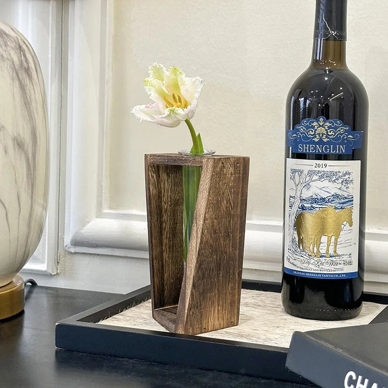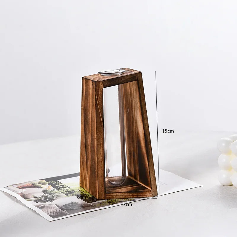 Vintage wooden hydroponic vase with a rustic stand and glass tubes—perfect for plant propagation or minimalist décor. Natural, charming, and beautifully handcrafted.
