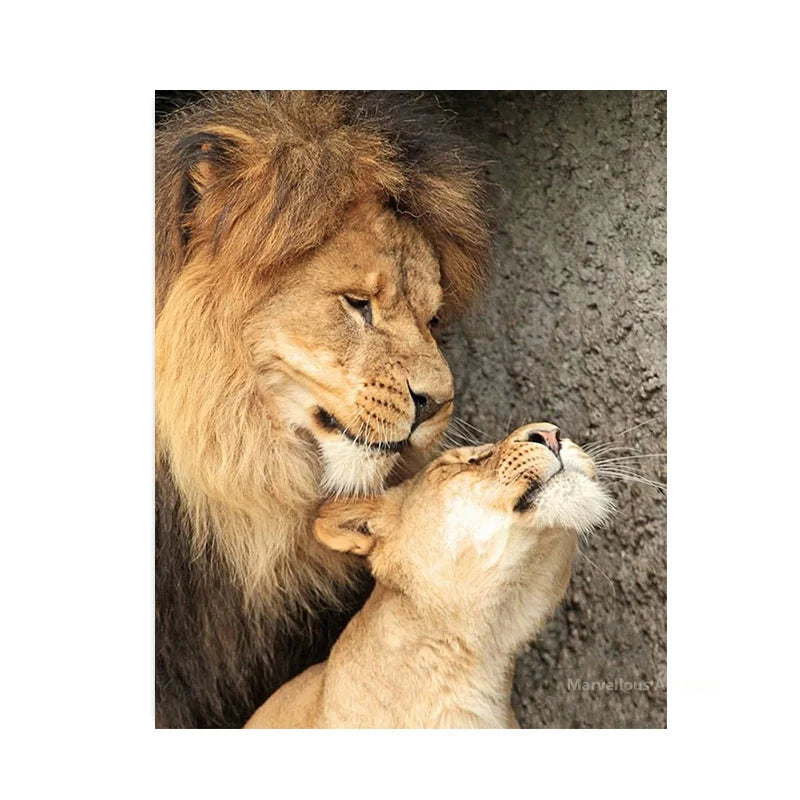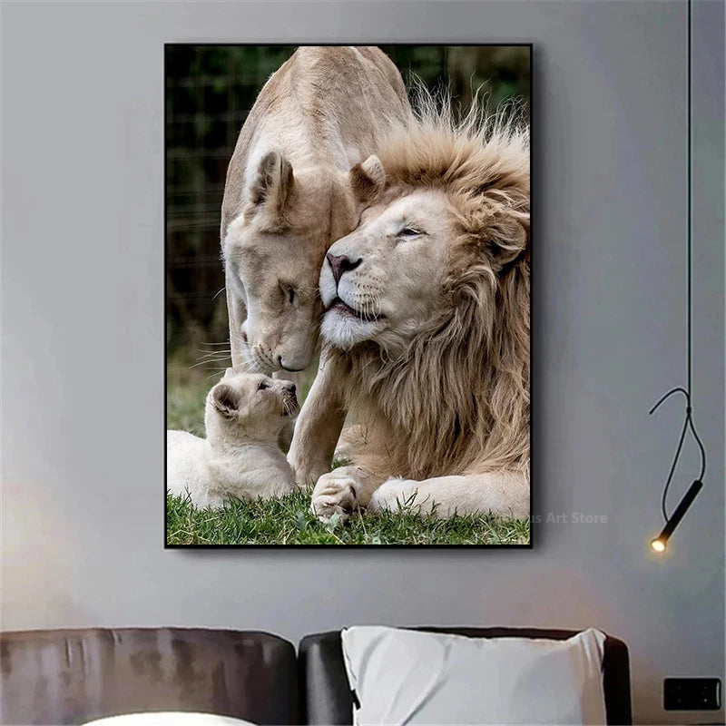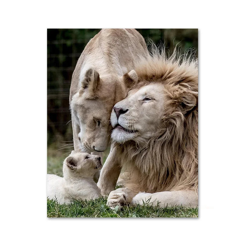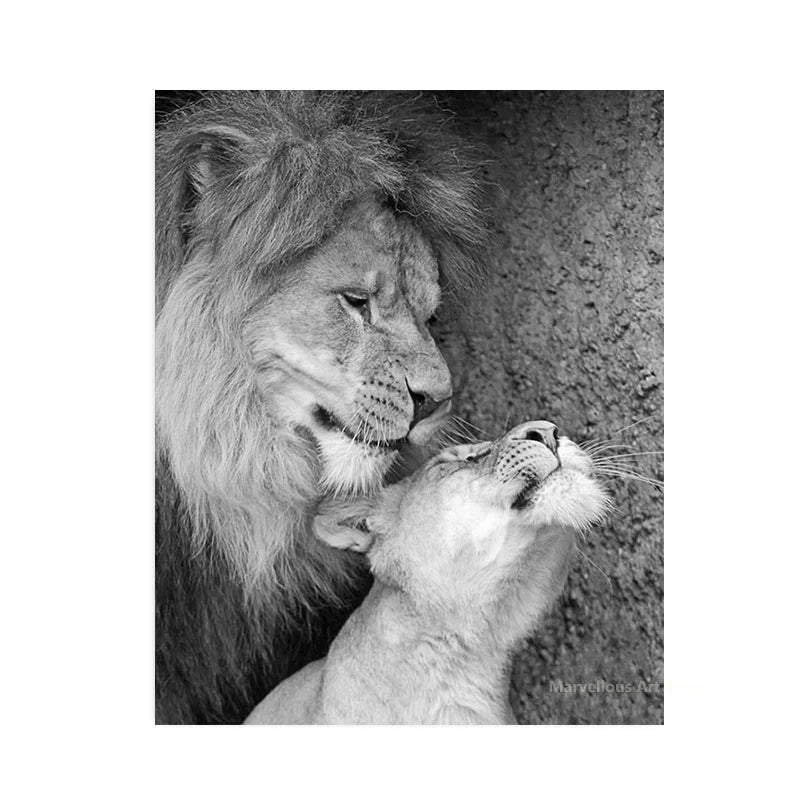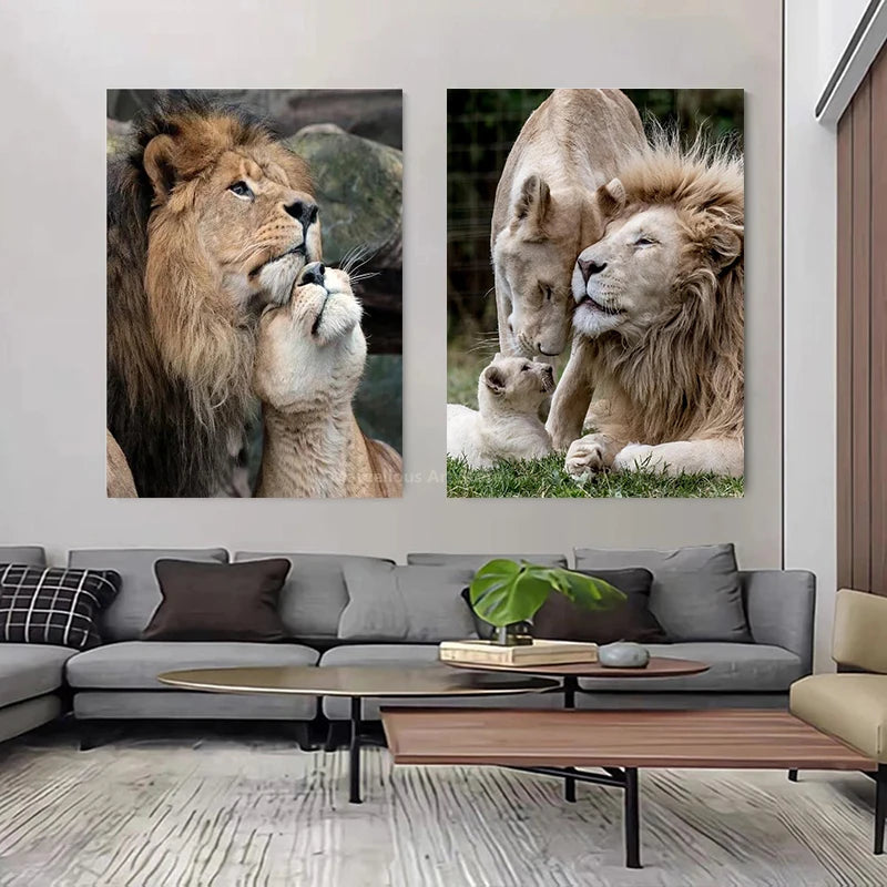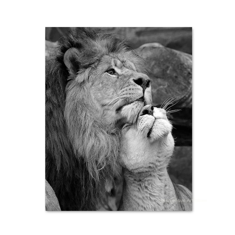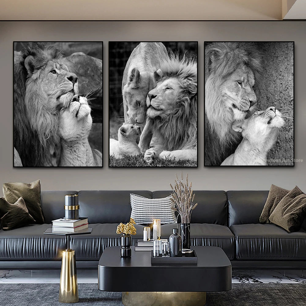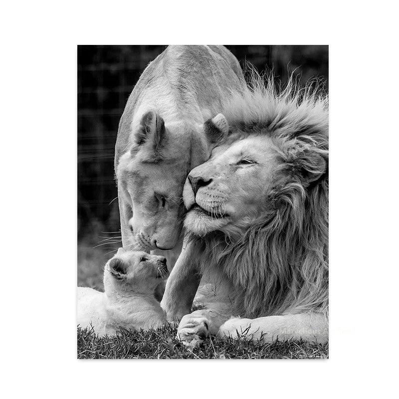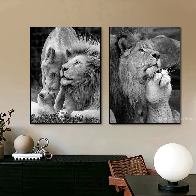 Elegant black-and-white poster featuring a tender lion family. Perfect for nursery walls or modern spaces — symbolizes love, strength, and unity.