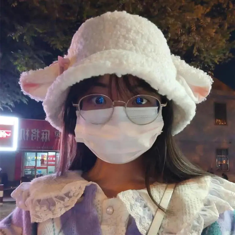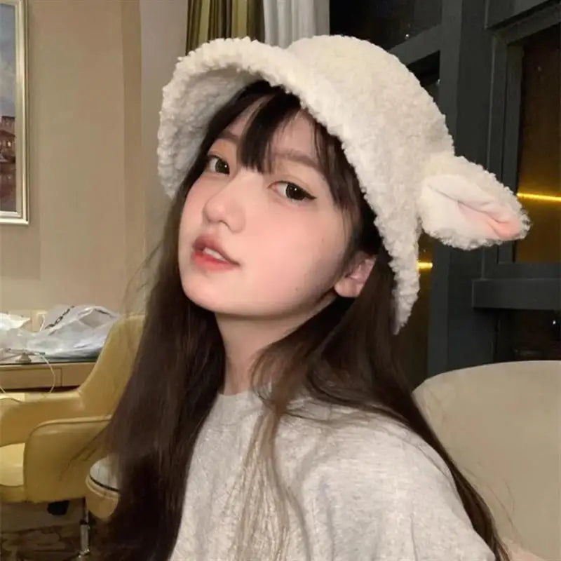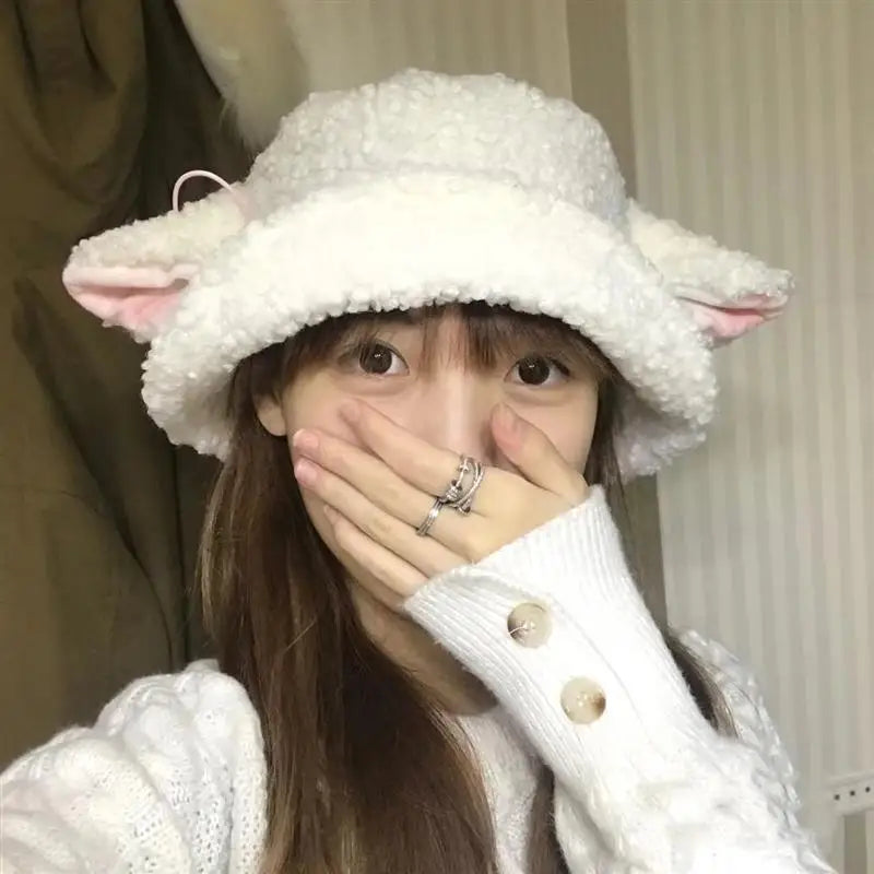 Faux Lamb Sheep Ears Fisherman Hat — cozy and cute with fluffy texture and ear details. Perfect for Y2K, kawaii, or soft girl winter aesthetic looks.