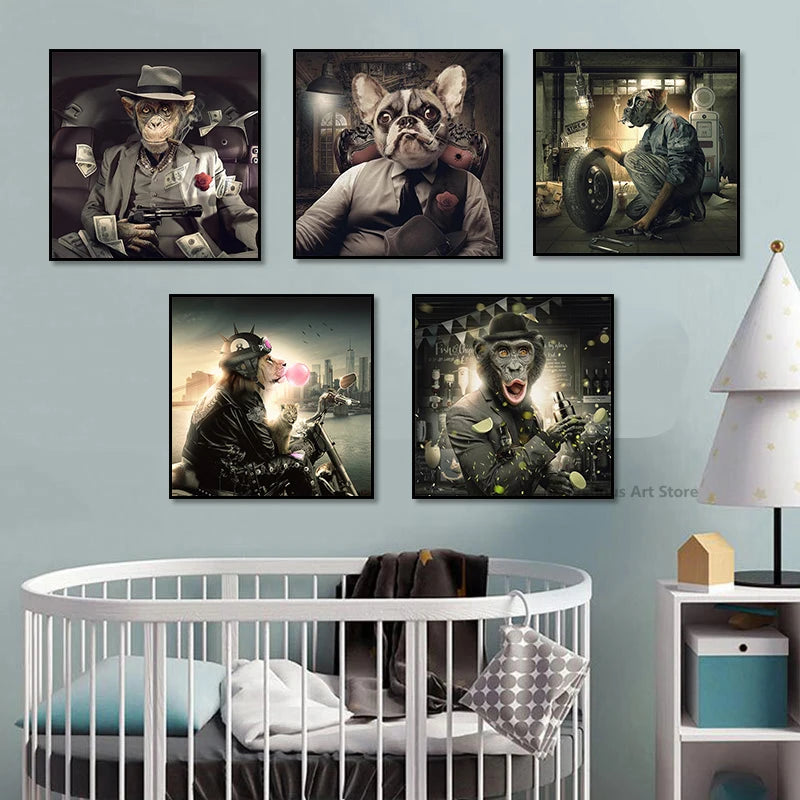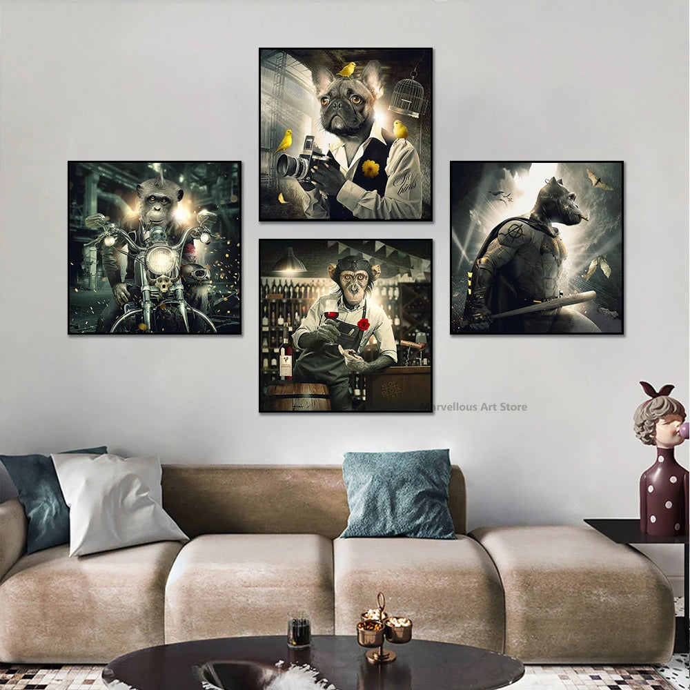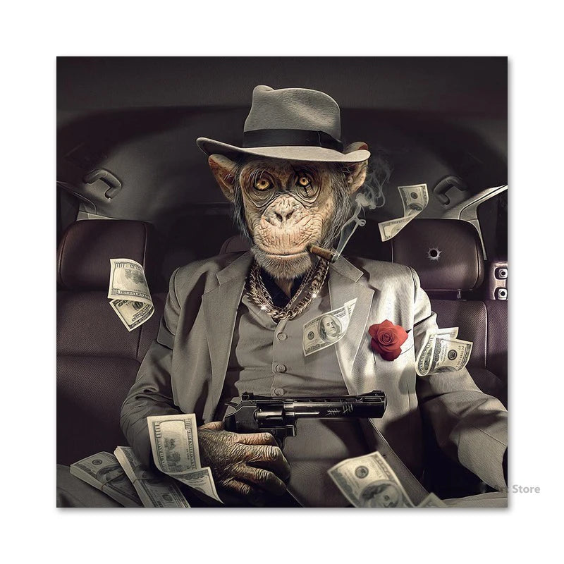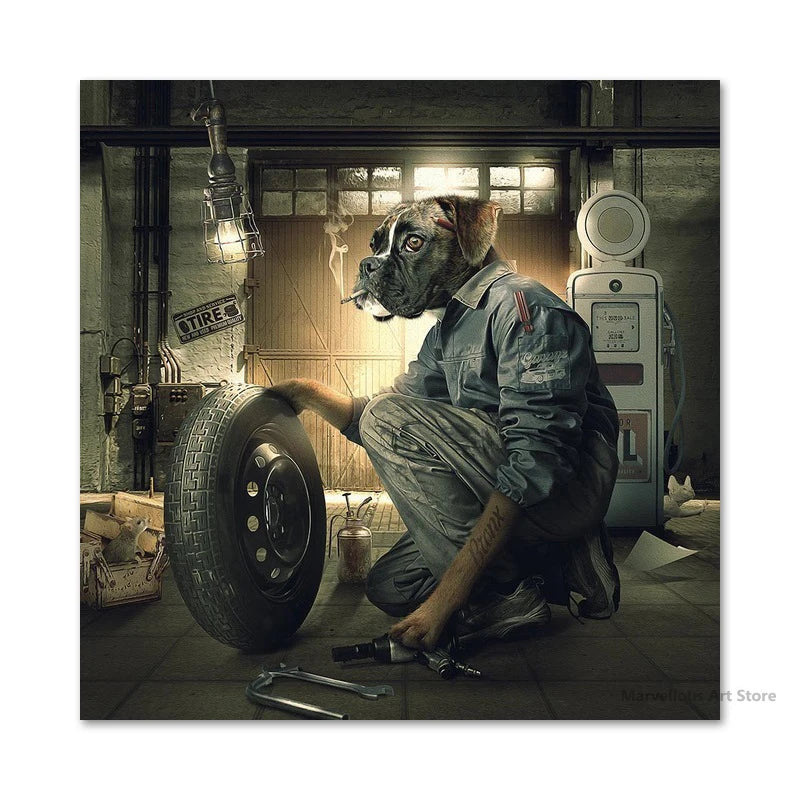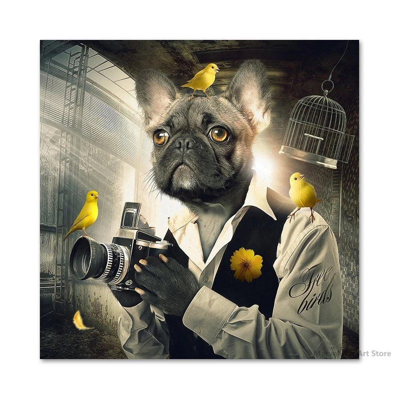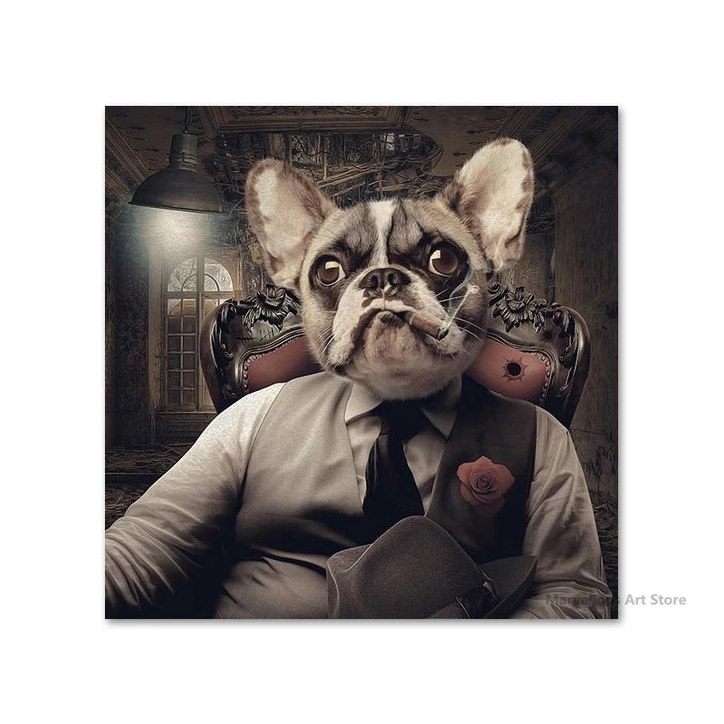 Póster de pared divertido y peculiar con un perro elegante en pose de jefe. Perfecto para añadir humor y personalidad a tu oficina o sala de estar.
