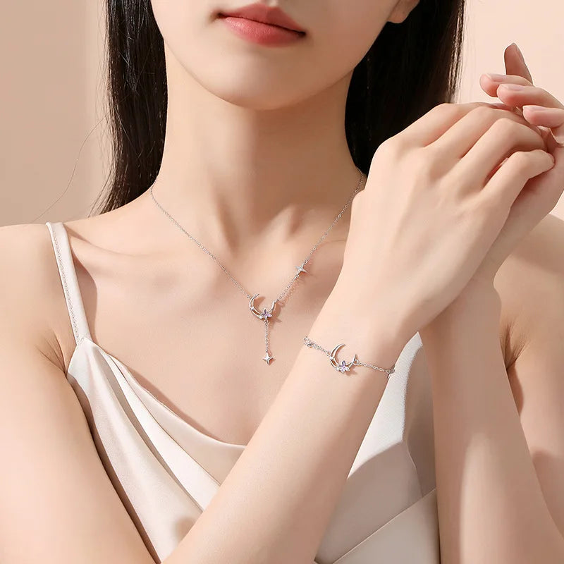 Sterling moon star bracelet—celestial elegance in polished silver, featuring delicate lunar and star motifs that evoke dreams, guidance, and cosmic charm. Perfect for layering or gifting to stargazers and romantics alike.