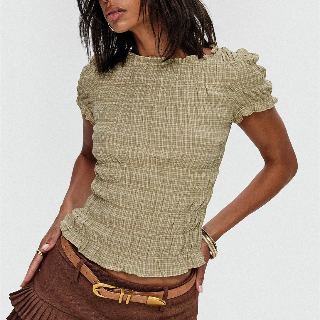 Y2K Trim Plaid Shirred Sleeve T-shirt
